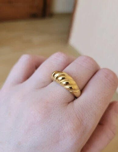 De ring is gemaakt van hoogwaardig roestvrij staal met een 18K gouden coating, waardoor je niet bang hoeft te zijn voor verkleuringen. Draag hem met trots en laat je fashion-forward kant zien met dit must-have accessoire! 💍🥐