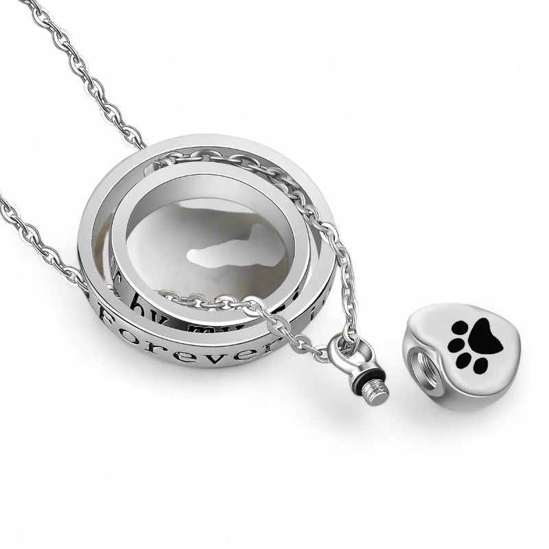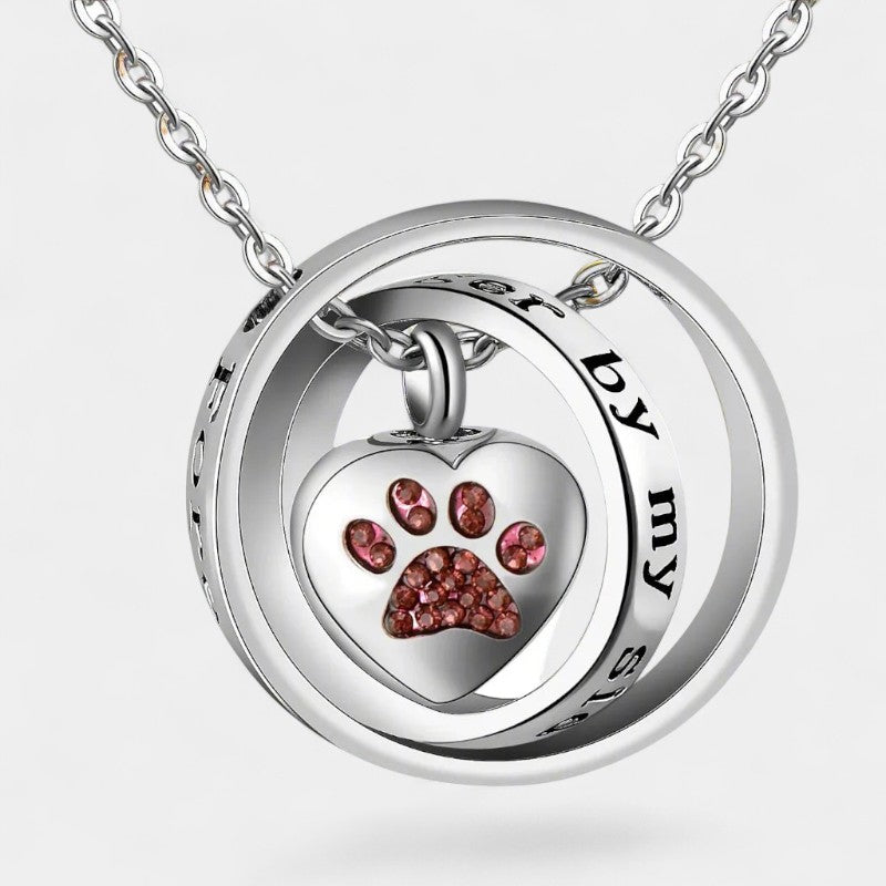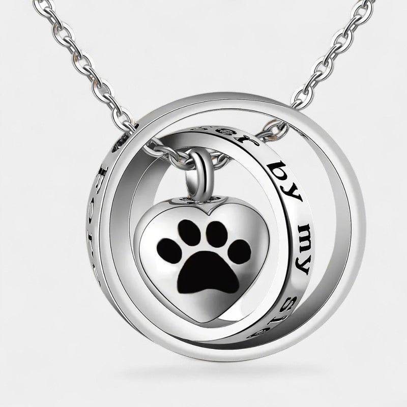 Deze hangerketting heeft een hartvormige hanger met pootafdruk en een klein compartiment. Het ontwerp biedt ruimte voor een symbolisch aandenken, zoals een kleine hoeveelheid as of een haarlok. Uitgevoerd in roestvrij staal met een gepolijste afwerking voor een gelijkmatige glans.