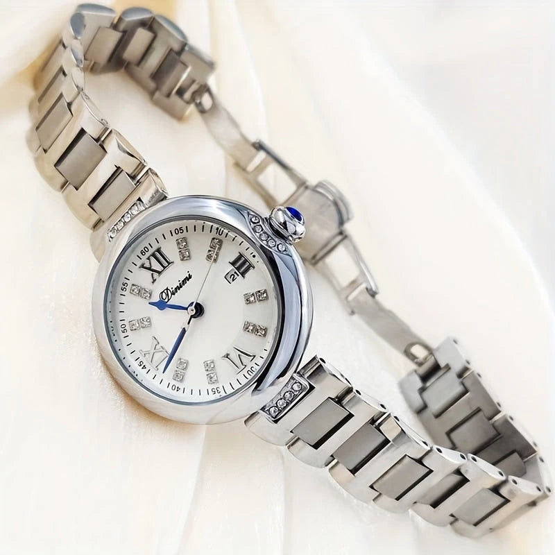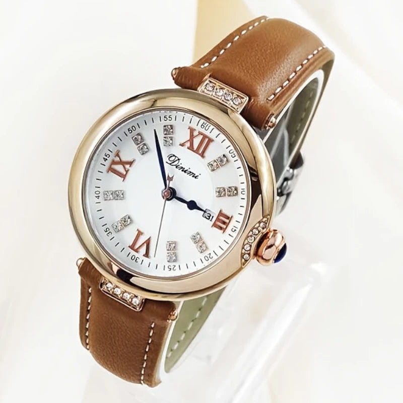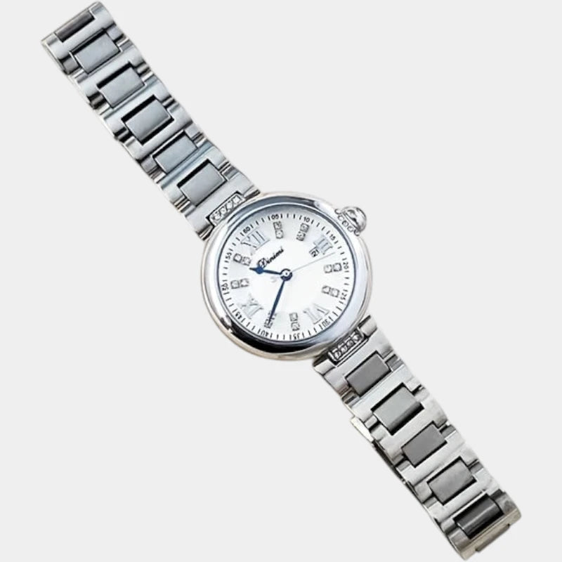 - Elegante Wijzerplaat: Versierd met Romeinse cijfers en kristalaccenten voor een luxueuze uitstraling.