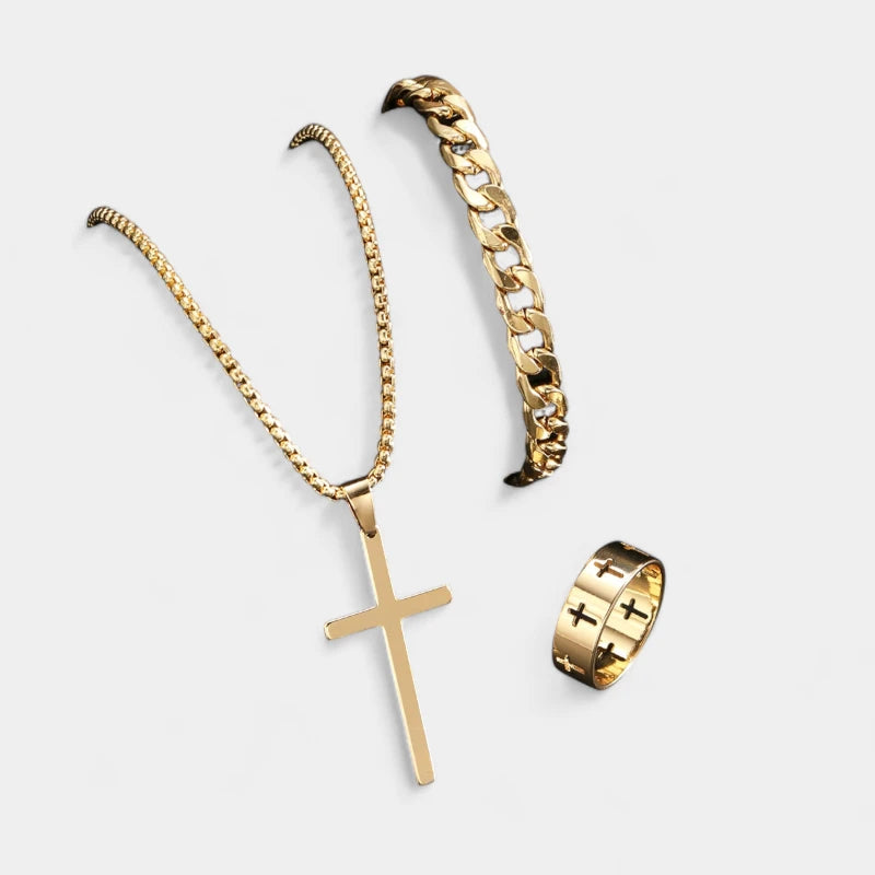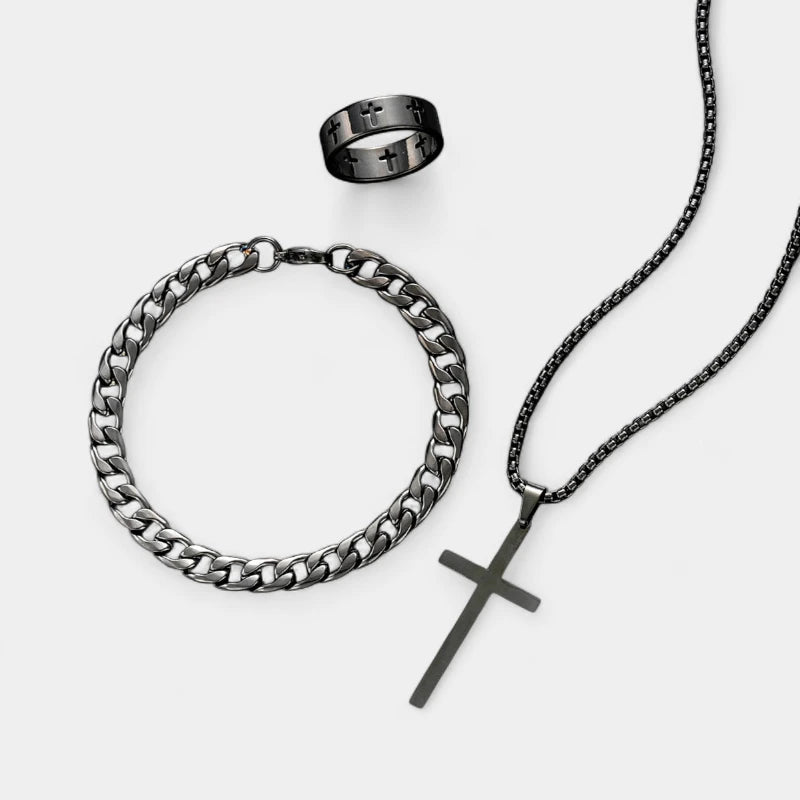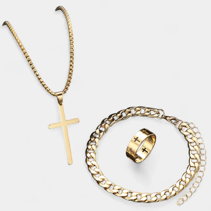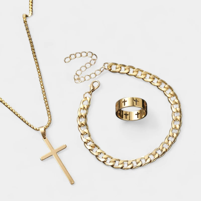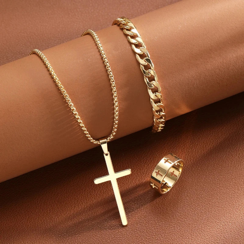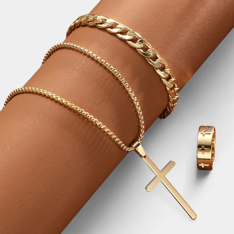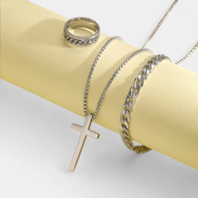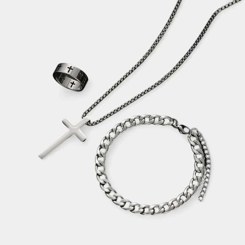 • Compleet Set: De set bevat een ketting met kruis hanger, een ring en een armband, waardoor je outfit in één keer compleet is.