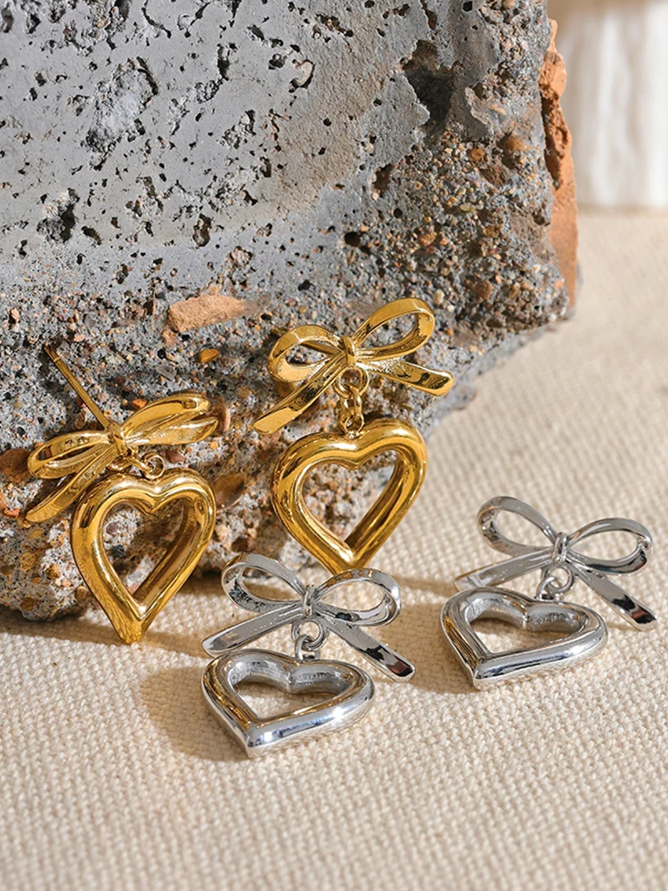 Voeg wat speelse romantiek toe aan je look met deze trendy strik oorbellen met een hangend hartje! De schattige strikvorm voegt een vleugje speelsheid toe, terwijl het hangende hartje een subtiele hint van romantiek geeft. Deze oorbellen zijn perfect voor dagelijks gebruik of voor een speciale gelegenheid waarbij je wilt stralen! 💖🎀