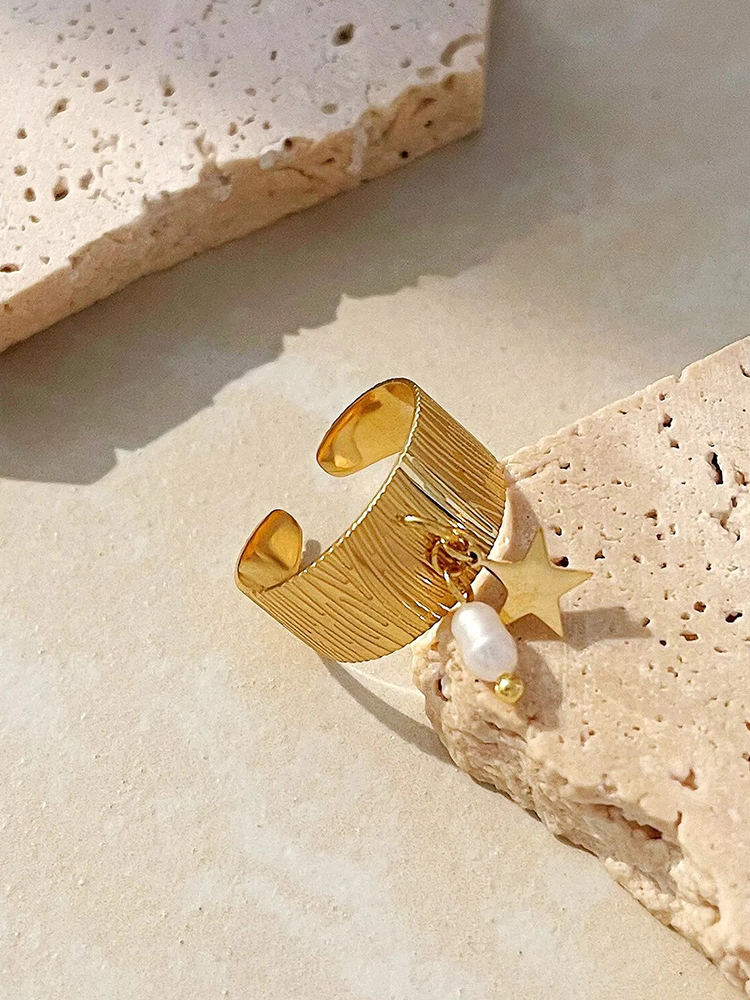 Voeg een vleugje speelse elegantie toe aan je look met onze parel & ster ring! Deze gouden ring heeft een verstelbare pasvorm, waardoor hij perfect is voor elke vinger.