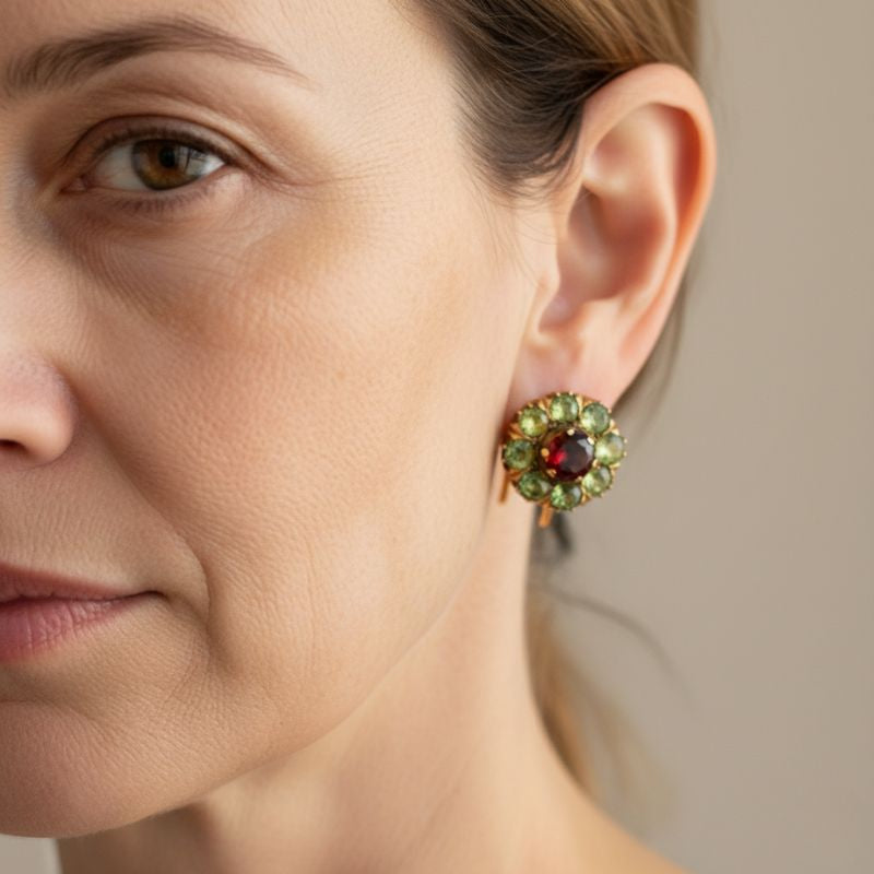 Vintage Ronde Groene & Rode Kristallen Oorbellen