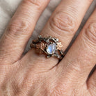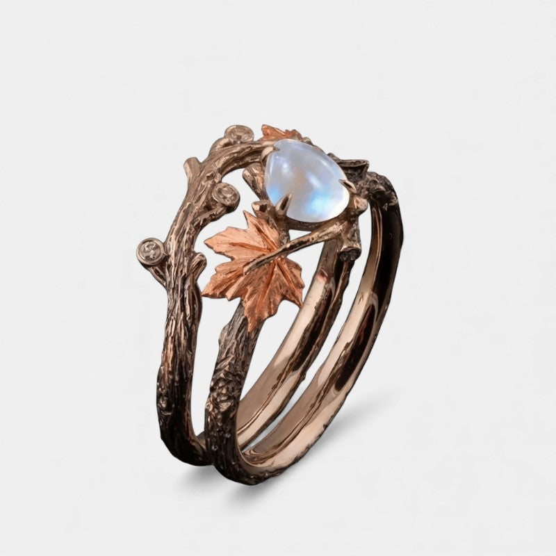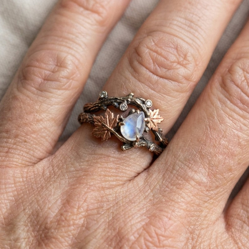Deze damesring met maansteen heeft een verfijnde takstructuur met bladdetail en een natuur geïnspireerde zetting. Het ontwerp volgt organische lijnen en voelt licht en comfortabel aan, met een rustige uitstraling die geschikt is voor dagelijks dragen.