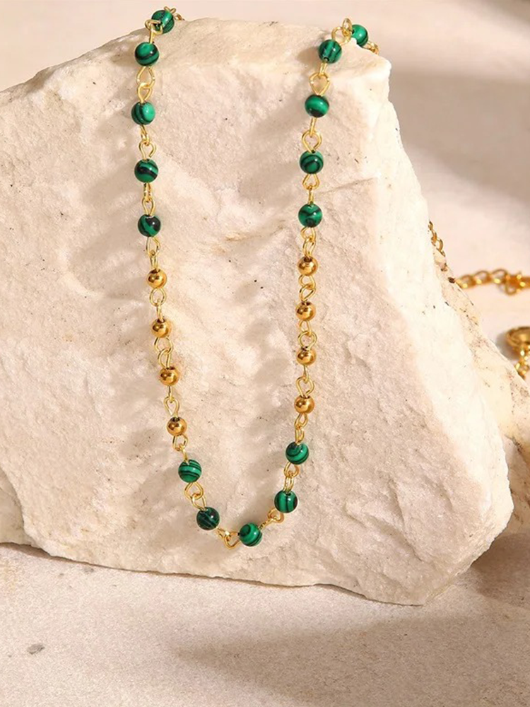 Let yourself shine with our beautiful malachite necklace! This necklace is adorned with small malachite beads that add a touch of natural beauty to your look. Malachite is known for its deep green color and has been valued for centuries for its spiritual and healing properties. With this necklace, you'll not only add a pop of color to your outfit but also carry a bit of natural energy with you! 🌿💚