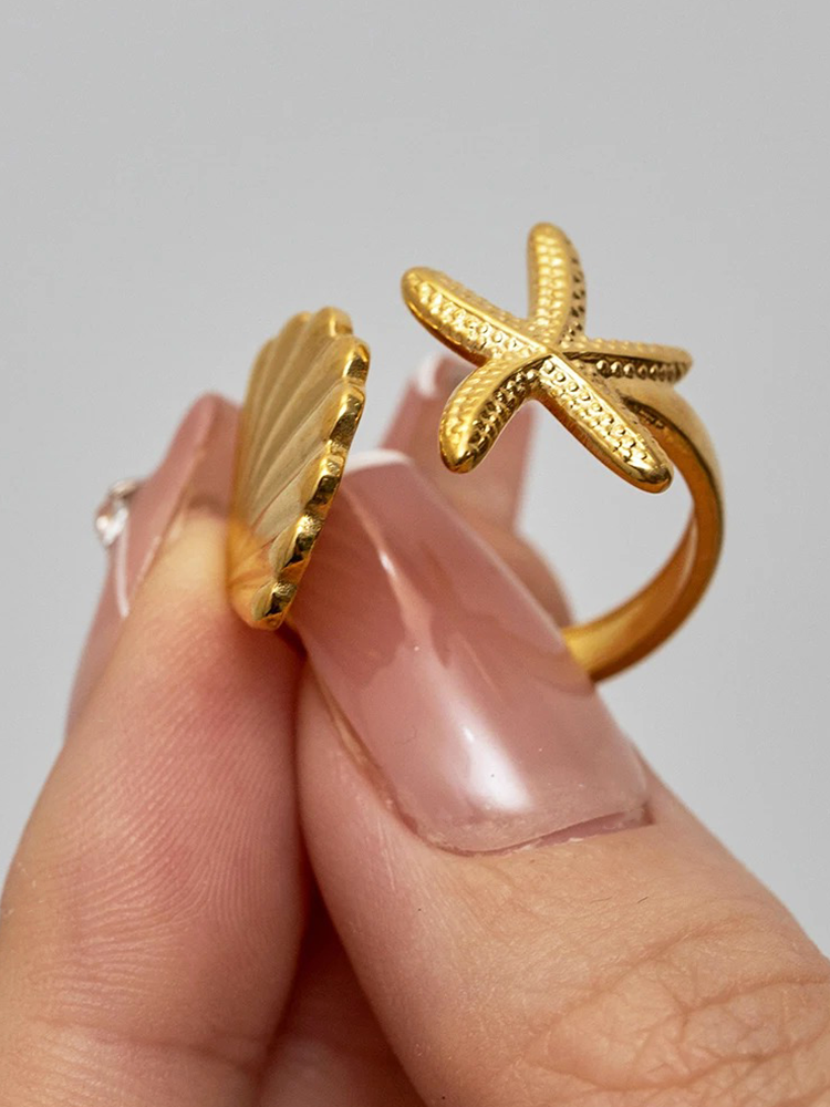 Add a playful touch to your summer look with this beautiful adjustable ring, inspired by the beauty of the sea! This gold ring is subtly adorned with a shell and a starfish, making you feel like you're always close to the ocean.