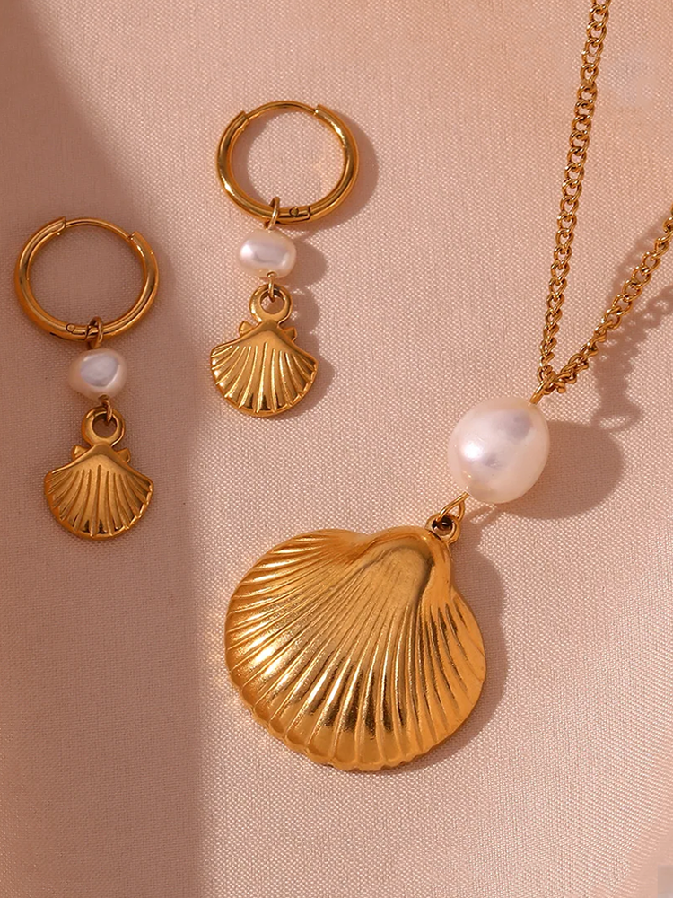 Add a touch of luxury to your look with this gold shell and pearl necklace! The combination of delicate shells and sparkling pearls creates an elegant and sophisticated look. Perfect for both everyday outfits and special occasions!