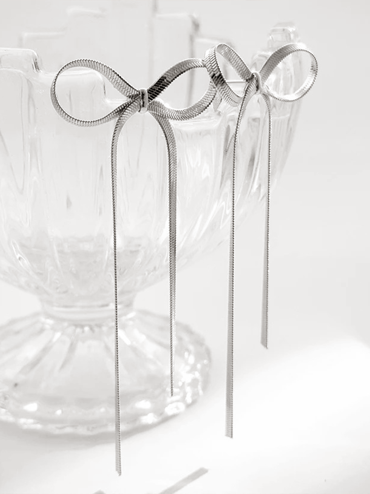 Add a touch of elegance to your look with our long snake chain bow earrings! These silver earrings combine the classic design of a snake chain with the charm of a bow, making them a perfect choice for any occasion.
