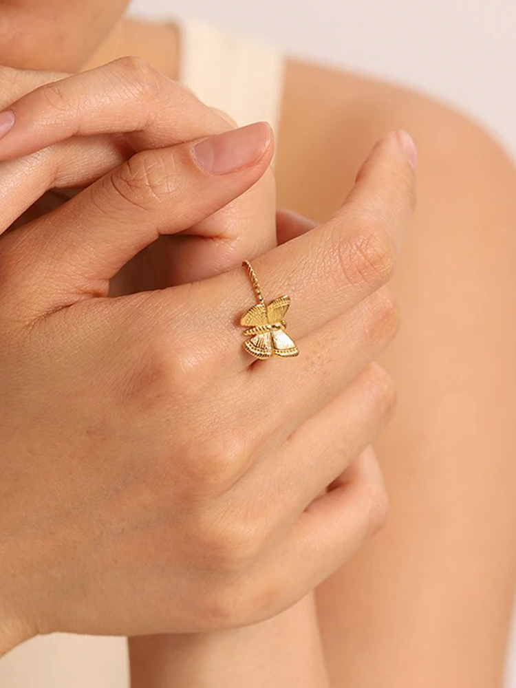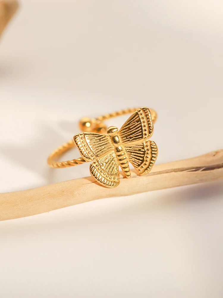 Deze ring is gemaakt van hoogwaardig roestvrij staal en voorzien van een 18K gouden coating die niet zomaar zal verkleuren. Draag deze ring solo voor een delicate en charmante uitstraling, of combineer hem met andere ringen voor een gelaagde look! 🦋💍